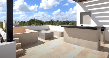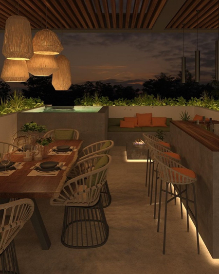 - Roof garden techado con pérgolas, barra de bar y sala de concreto