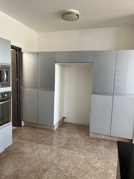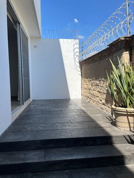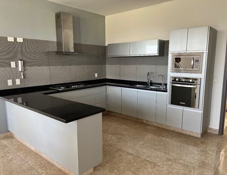 la cocina integral cubierta de granito , sala comedor con acceso al patio trasero empedrado y en desnivel, medio baño, cuarto de lavado muy amplio y cuarto de servicio con baño, cochera techada para tres autos.