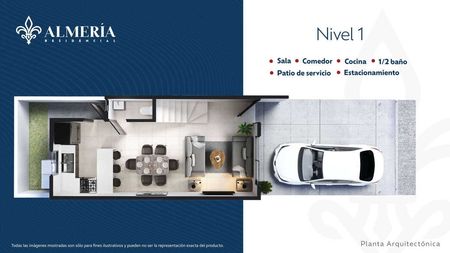1er nivel: Sala, comedor, cocina, medio baño, patio de servicio y estacionamiento para 1 auto.