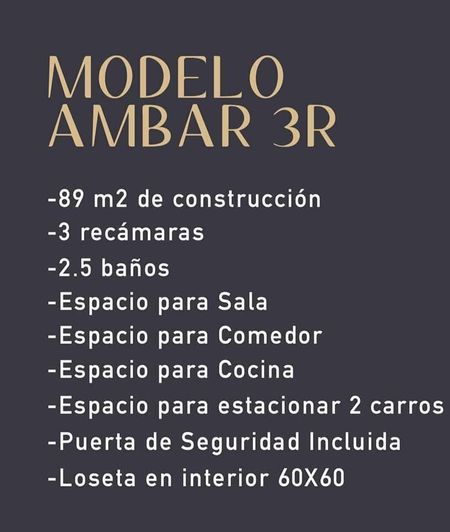 MODELO AMBAR 3R, 3 recámaras, recámara principal con gran espacio de Walk-in clóset y su baño privado. 2.5 baños Espacio de sala, comedor y cocina 89m2 de construcción Desde 120m2 de terreno Loseta 60x60, puerta principal de seguridad, firme de concreto al frente para estacionar 2 carros y peatonal, Precios desde $2,580,000.00