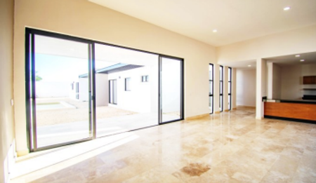 Vivienda de una planta con 305 m2 de construcción, con sala/comedor a altura y media, cocina vestida, tres recámaras con baño completo, baño de visitas completo, cuarto de servicio con baño completo, área de tendido, jardines interiores, cochera techada para dos autos, terraza techada y alberca.