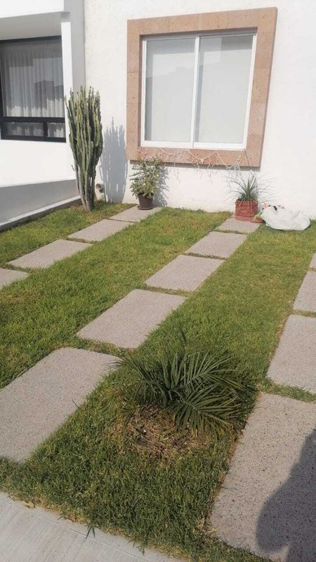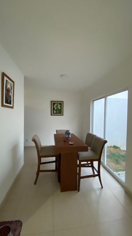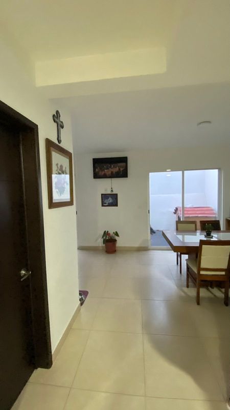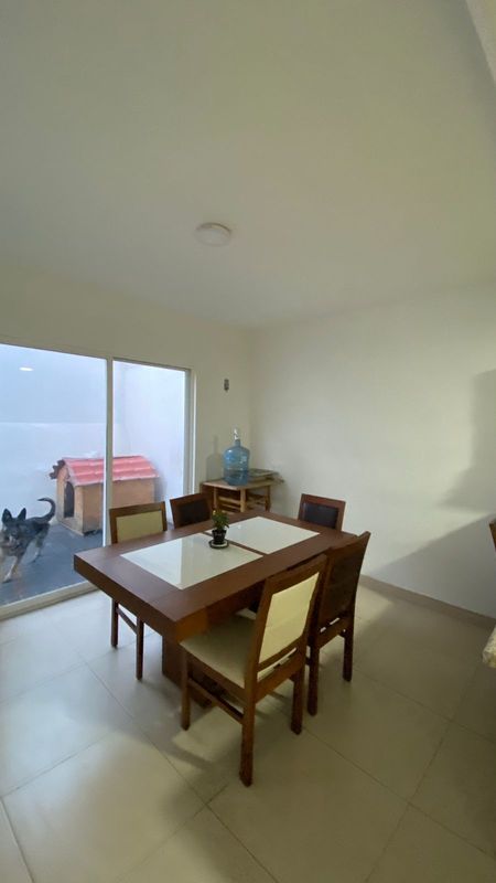 Sala, comedor, cocina integral con barra, cuarto de lavado, covacha, jardín trasero pequeño, estacionamiento para 2 autos, 1/2 baño de visitas