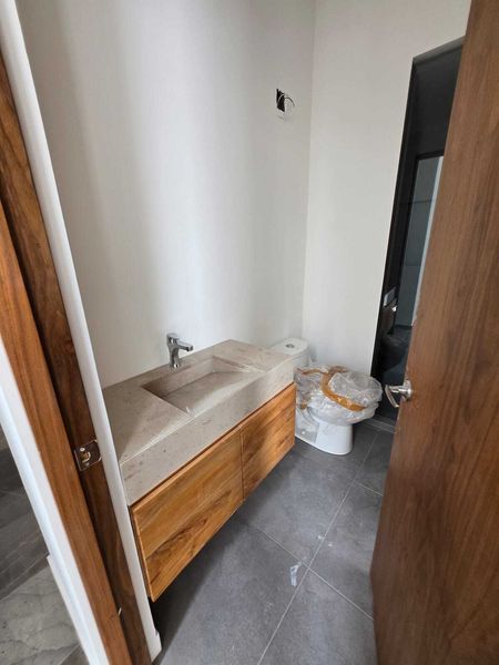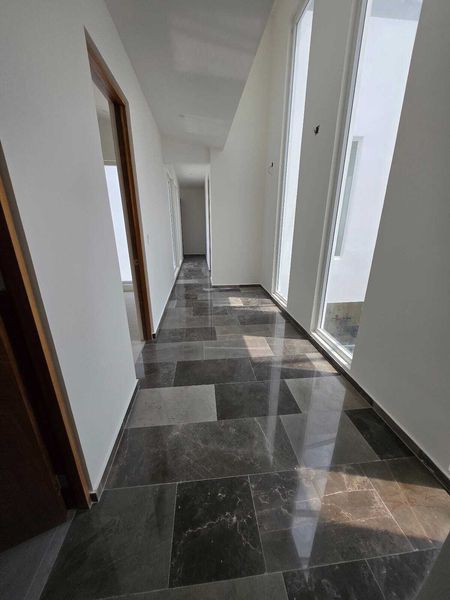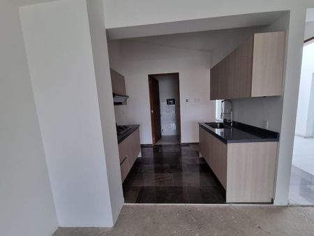 Sala, comedor, área de lavado. 3 recámaras, 3 baños. Terminados en mármol en baños y granito en cocina. 2 estacionamientos. Bodega.