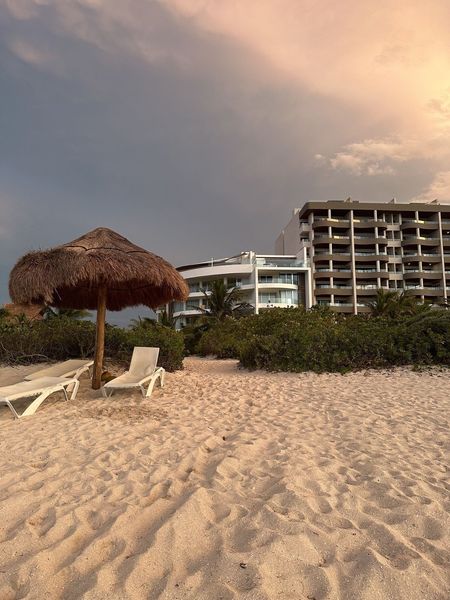 -Palapas en la playa con camastros