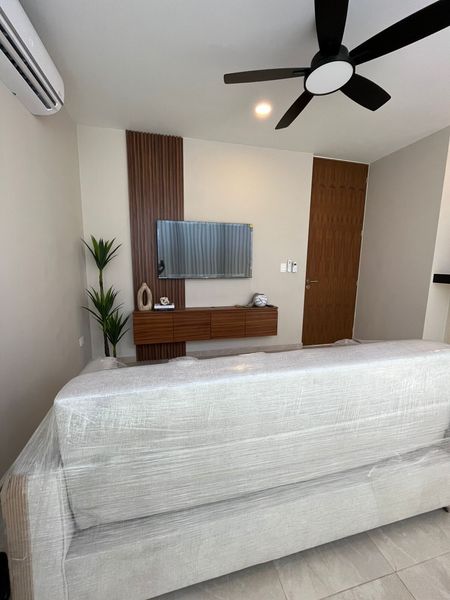 Equipamiento: parrilla eléctrica, calentador eléctrico, carpintería inferior en cocina, closets semi vestidos, cancel fijo de cristal templado, portón eléctrico, pisos 50 x100, granito negro San Gabriel en meseta de cocina, puertas de triplay de tzalam, muros acabado yeso.