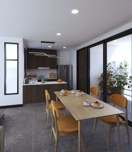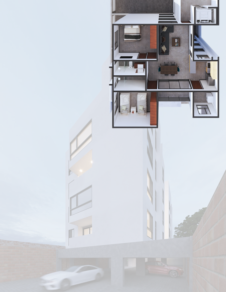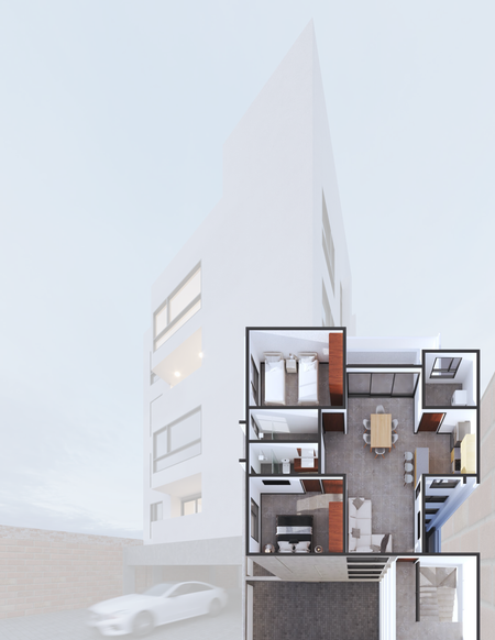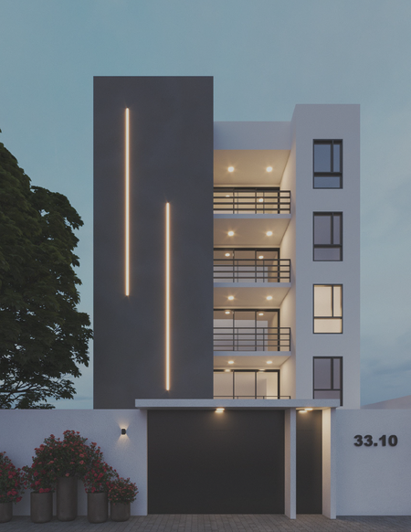Son dos torres con 4 departamentos en cada una, con elevador y  paneles solares que cuentan con: