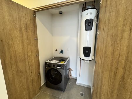 Cocina integral equipada con refrigerador, microondas y área de lavado con lavasecadora