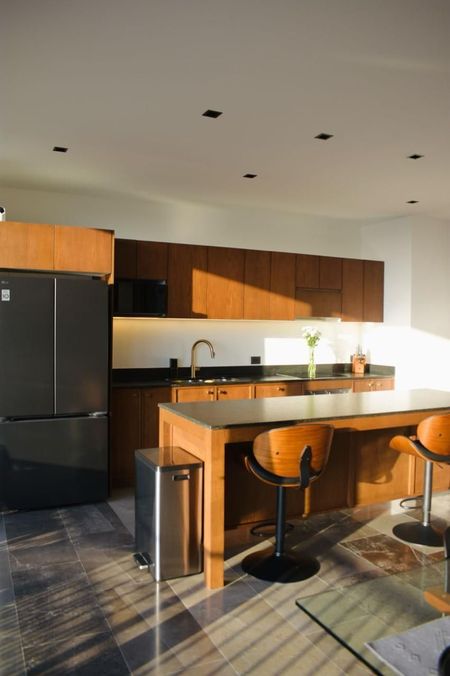 - Horno de convección, parrilla de inducción, campana extractora y doble tarja en