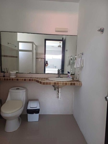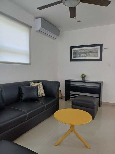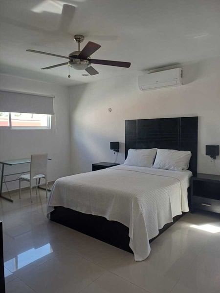 * 1 recámara con closet, baño completo, cama queen size, aire acondicionado, ventilador y persianas blackout