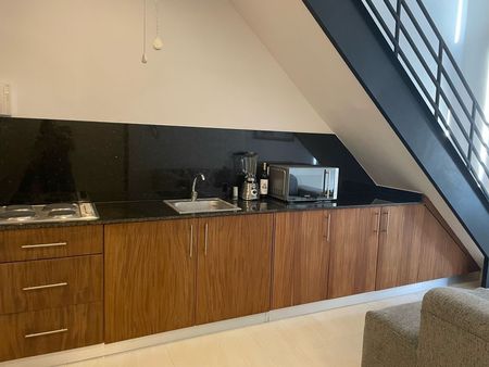 Cocina : barra de granito, gabinetes de madera, parrilla eléctrica, refrigerador y horno de microhondas inverter