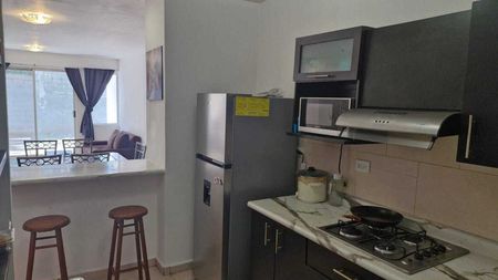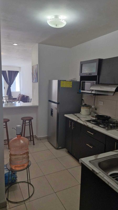 • Cocina integral, campana, refrigerador, microondas, parrilla eléctrica, enseres domésticos, barra desayunador con bancos