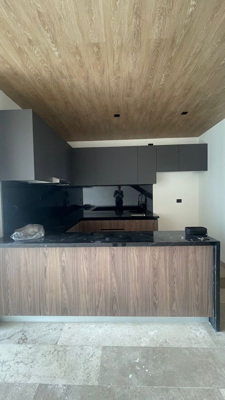 - Cocina integral con parrilla eléctrica, campana extractora y cubierta de granito.