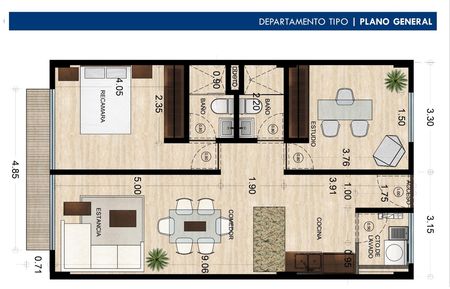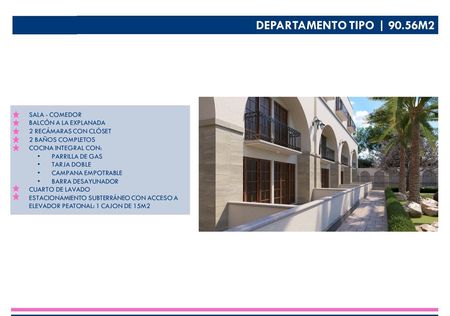 El departamento cuenta con sala comedor con terraza de vista a la explanada, la cocina, dos recámaras con closet y baño completos, una de ellas con vista a la explanada, y un cuarto de lavado.