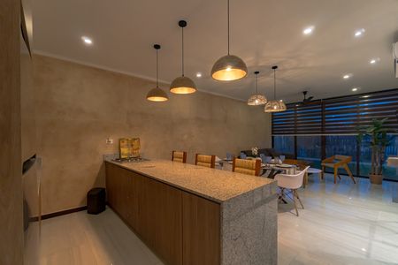 Cocina equipada y vestida con barra desayunadora.