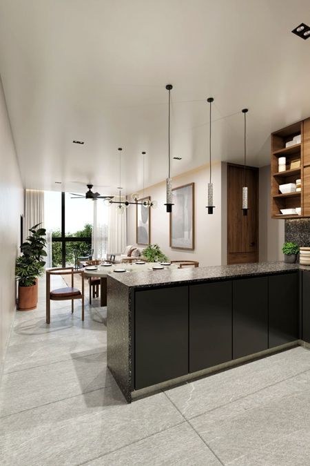 Cocina en concepto abierto con barra desayunador