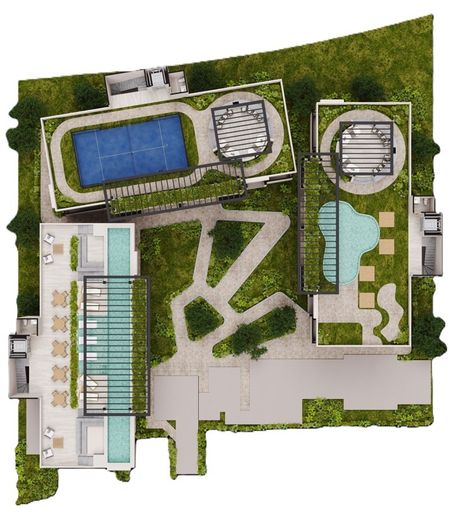 Canal de nado, pool lounge, salón de usos múltiples, zona de asadores, tina de inmersión, espacios para yoga, alberca familiar, áreas para tomar el sol, jacuzzi, gimnasio, sala para niños, roof garden, sala de juntas, cancha de pickleball, área de juegos, jardín lounge, espacio de coworking y jardín zen.