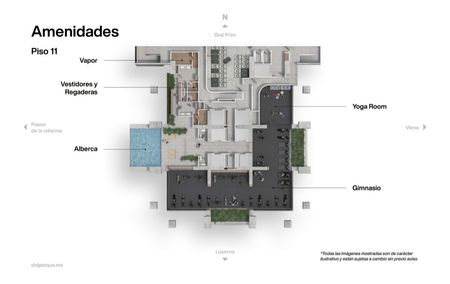 • Nivel 11, diseñado para el bienestar, con gimnasio, regaderas con vestidores, alberca y yoga room.
