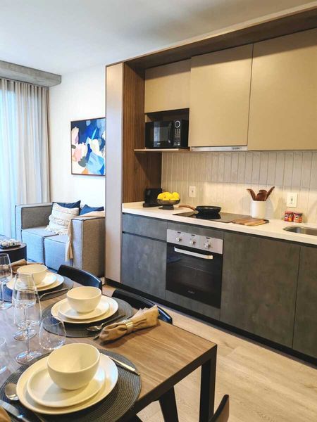 El departamento ya cuenta con línea blanca como Parrilla eléctrica, Campana de cocina, Persianas / Cortinas, Horno de Microondas, Refrigerador.