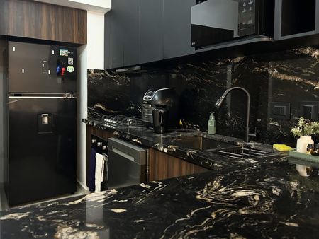 Área social con comedor para 6 personas, sala de dos piezas, lavandería con centro de lavado y cocina con cubierta vía láctea, equipada con barra desayunadora, refrigerador, parrilla eléctrica, campana, horno y microondas.
