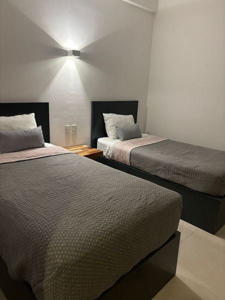 Recámara secundaria: dos camas individuales, closet, persianas dobles, aire acondicionado y ventilador de techo