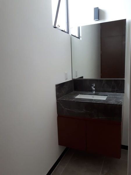 Espejo, gaveta inferior en lavabo y cristal templado en baño.