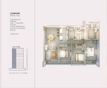 Un lugar por excelencia para quienes valoran la comodidad, tranquilidad y calidad de vida. Vive rodeado de sofisticación y diseño contemporáneo en un entorno que combina elegancia, funcionalidad y exclusividad. Departamento Modelo CONFORT