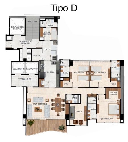 198m2 habitables + 18m2 terraza, 3 recámaras con baño y walk in closet, 3.1 baños, 2 estacionamientos, familyroom, cuarto de servicio, área de lavado, bodega, piso 8 (también hay otra opción de piso- preguntar)