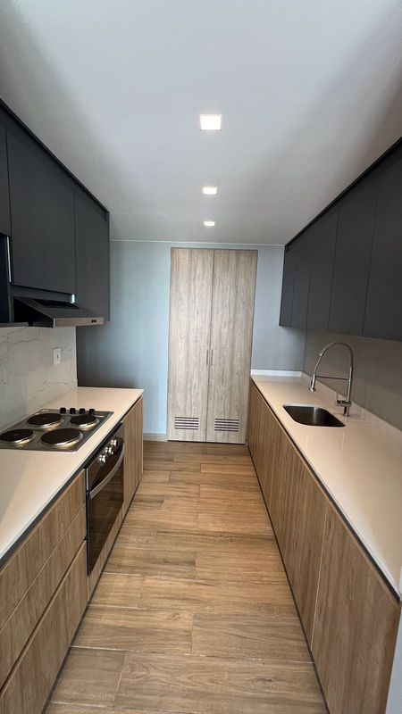 Cocina integral equipada con estufa, campana y tarja con monomando