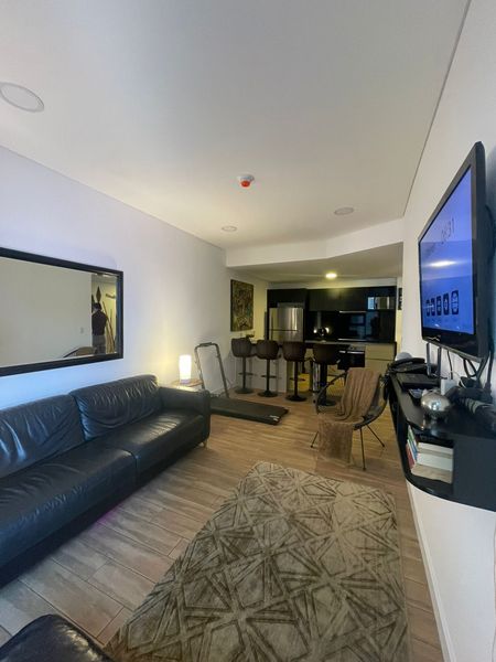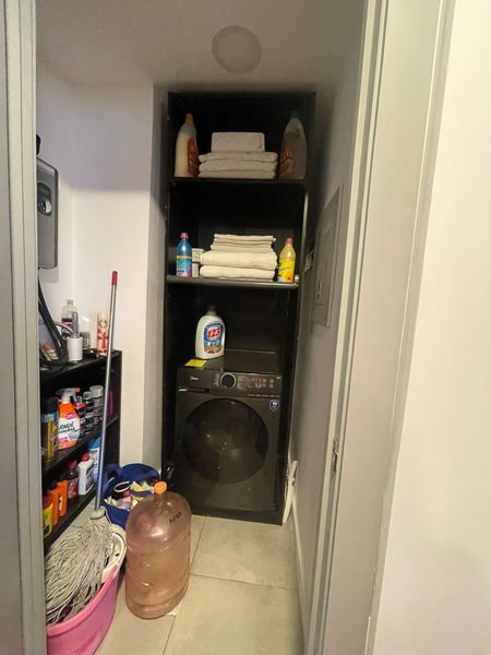 Lavadora y secadora, sala, cama, bancos, televisión