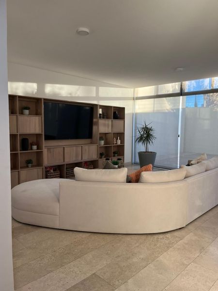 Sala, comedor, cocina a espacio abierto, 3 recámaras principal con vestidos y baño completo, las dos recámaras secundarias comparten baño, cochera 2 autos