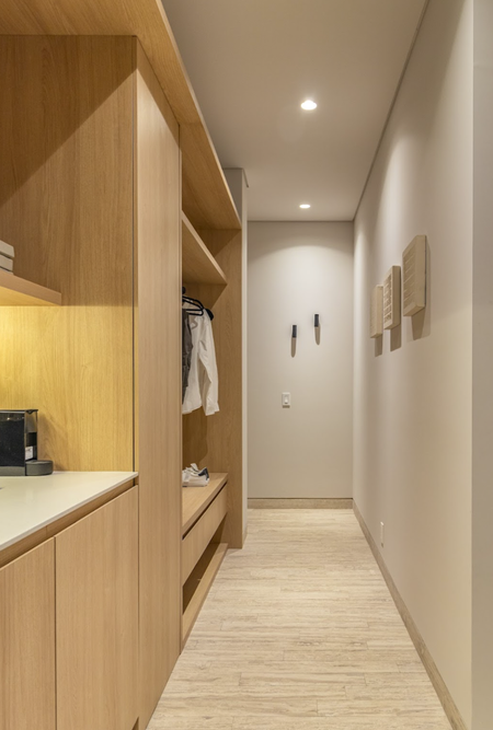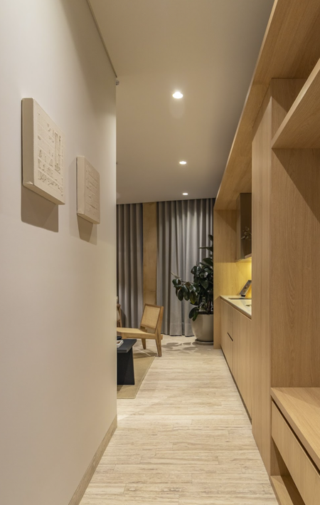 Con 44 departamentos distribuidos en 11 niveles, cada planta incorpora vegetación que enmarca los ventanales y aporta frescura visual. En la planta baja se ubican locales comerciales y una plaza pública que conecta el proyecto con su entorno urbano.
