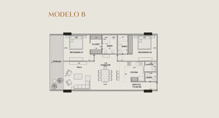 Área total: 162.92 m2 (interior 115.92 m2 + 16.8 m2 de terraza + 2.4 m2 de bodega).