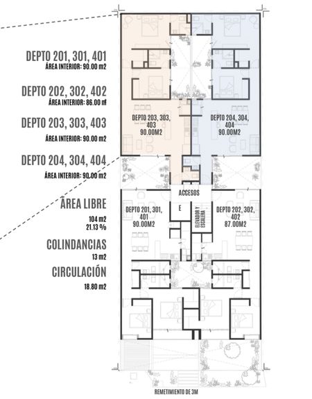 Proyecto de 20 departamentos de 86m2 a 90m2; espacios que se adaptan a los diferentes tipos de usuarios con demandas actuales. El conjunto se desarrolla en 5 niveles y un nivel de estacionamiento.