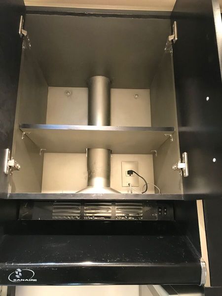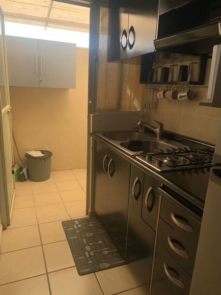 Cocina equipada con extractor, alacena y estufa.