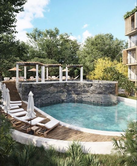 Escondido en lo profundo, el cenote ofrece una piscina de mayor profundidad como espacio común. A un lado se sitúa un salón de eventos. La cascada que conecta al río produce una vista escénica complementada por las especies tropicales dentro de esta área, creando el balance entre naturaleza y centro de convivencia.