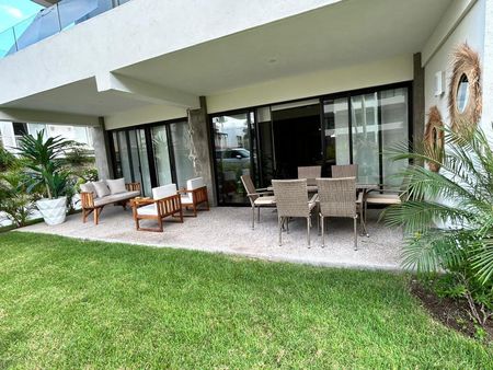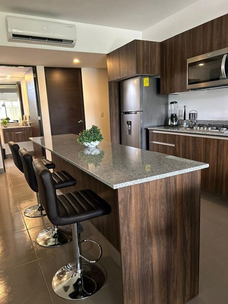 Disfruta de acabados de primera, espacios amplios y luminosos, y una comunidad vibrante en este departamento en planta baja con terraza, 3 recámaras la principal con baño completo y vestidor, cocina equipada, sala, comedor, cuarto de lavado y 2 estacionamientos.