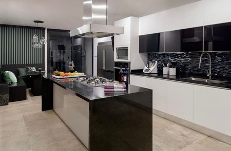 Cocina diseñada con bastante espacio agradable y al mismo tiempo útil. Espacio suficiente para un refrigerador subzero y alrededor hay bastante espacio para guardado.