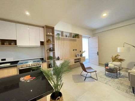 Cocina completamente equipada con granito, estufa, campana, mini split en sala y en recámara principal.