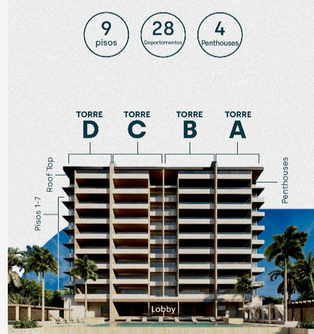 9 pisos, 28 Departamentos y 4 Penthouses.