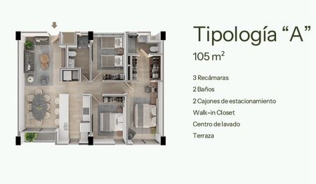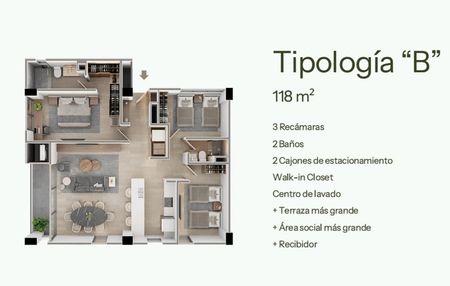 TIPOLOGIA B: Cuenta con recamara principal con walk-in closet, Recibidor, Centro de Lavado integrado, una muy amplia area social y Terraza.