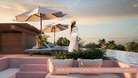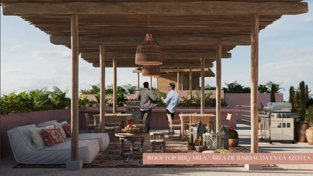 - Piscina infinita en la azotea de 17 metros, área de fogatas, zona de comedor y sala de estar con barbacoa