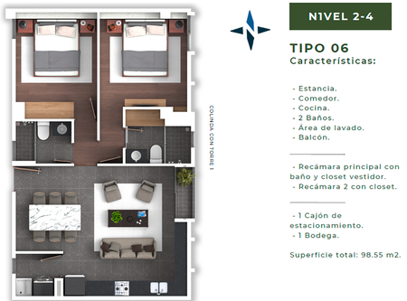 Torre de 4 Niveles con Departamentos de 1 y 2 Recámaras.