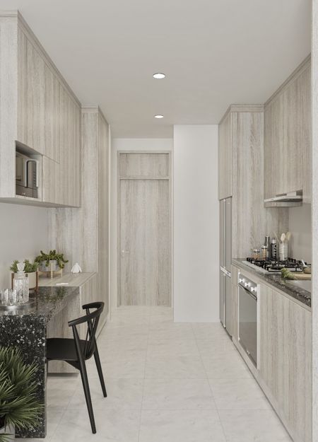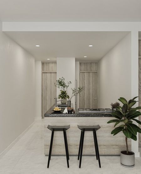 Cocina equipada con barra de granito.