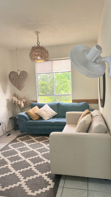 - Sala equipada con dos sofás, tapete, decoración en forma de corazón y 3 cuadros.
