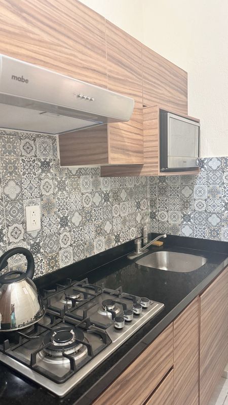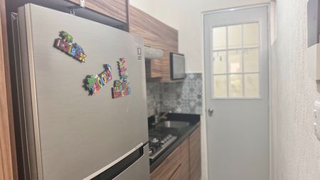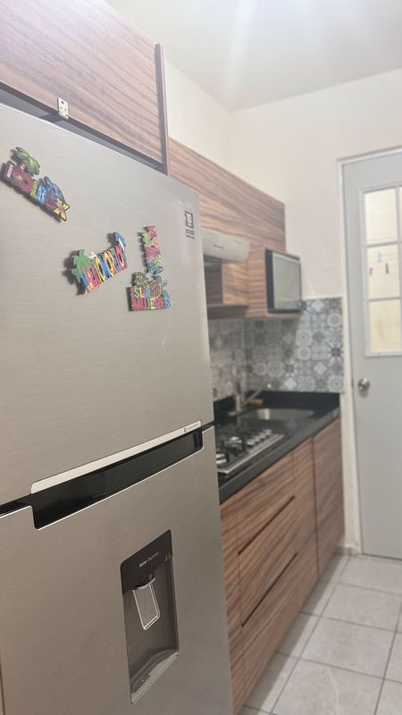 - Cocina equipada con estufa eléctrica con campana y 4 quemadores, un refrigerador marca Samsung, un microondas marca Winia y una licuadora marca T-fal.