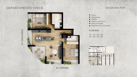 Tipo B 108 M2 + 15M2 terrazas= 123M2 con 2 recs, 2 baños, 1 auto