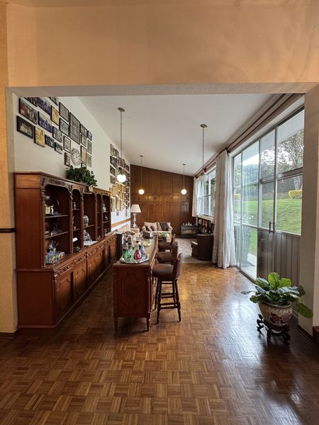 Gran espacio incluye cantina preciosa tipo antiguo labrada con barra y contrabarra, en gusto muy fino, con bancos, cava y licoreras. esta sala que funciona como sala informal, familiar y salón de juegos. De preciosa personalidad, con ventanales y salida a jardines. Señora residencia es para el conocedor del buen vivir.