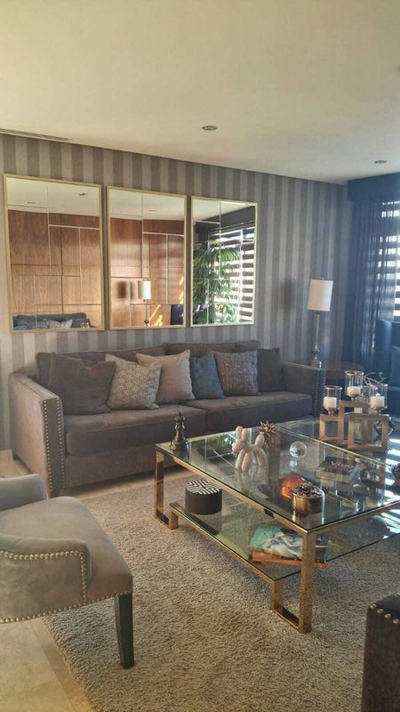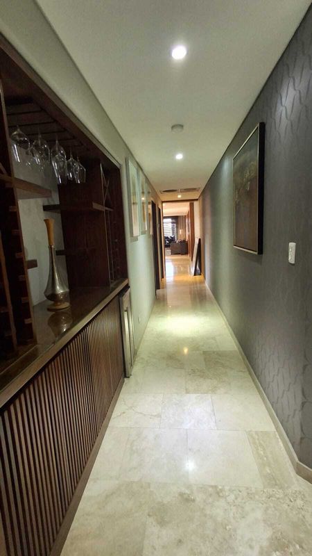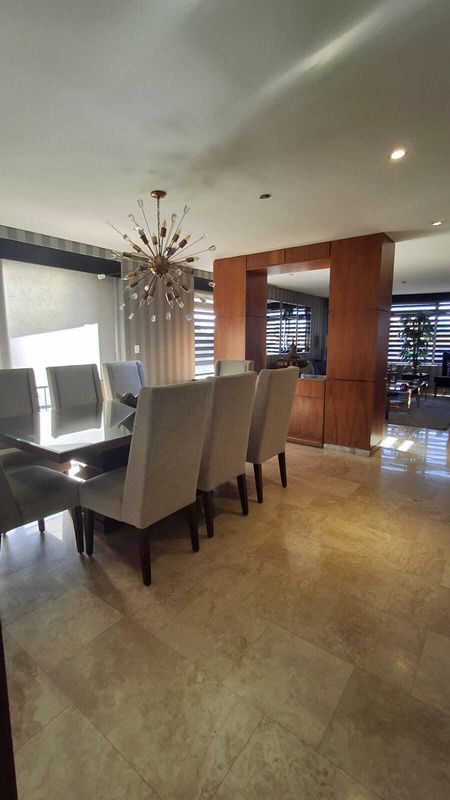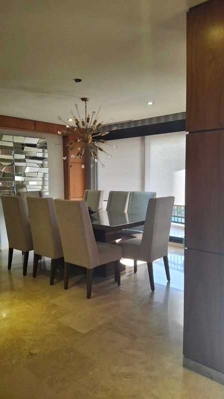 Departamento amueblado con 380 m2, cuarto para el personal de servicio con baño completo independiente, 2 salas, 2 comedores, cocina totalmente equipada con horno instalado a su medida, cada recamara cuenta con su propio baño con regadera, 1 medio baño para visitas, walking closet en cada una de las recamaras, aire acondicionado, estacionamiento para 3 carros sin mencionar que cuenta con mas de 10 amenidades el residencial.