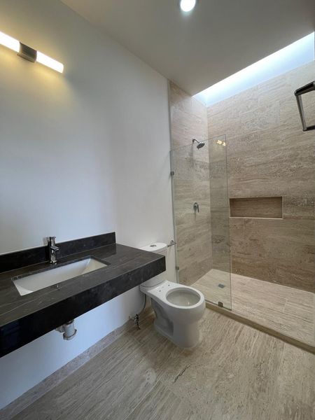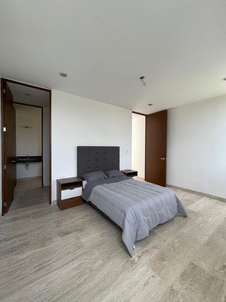Recámara principal con espacio para closet vestidor, baño completo con doble lavamanos y balcón