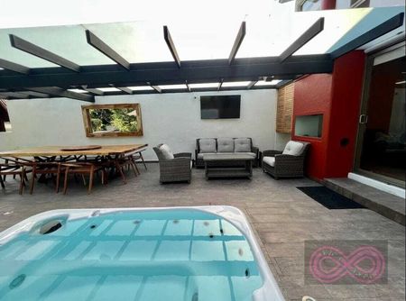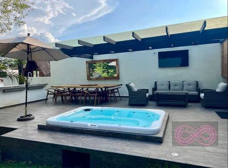 Disfruta de momentos inolvidables en la terraza donde encontrarás el jacuzzi un comedor espacioso al aire libre y un fogatero, ideales para cenas bajo las estrellas y convivios con amigos y familiares. La chimenea exterior añade un toque especial, permitiendo extender tus reuniones al aire libre incluso en las noches más frescas.